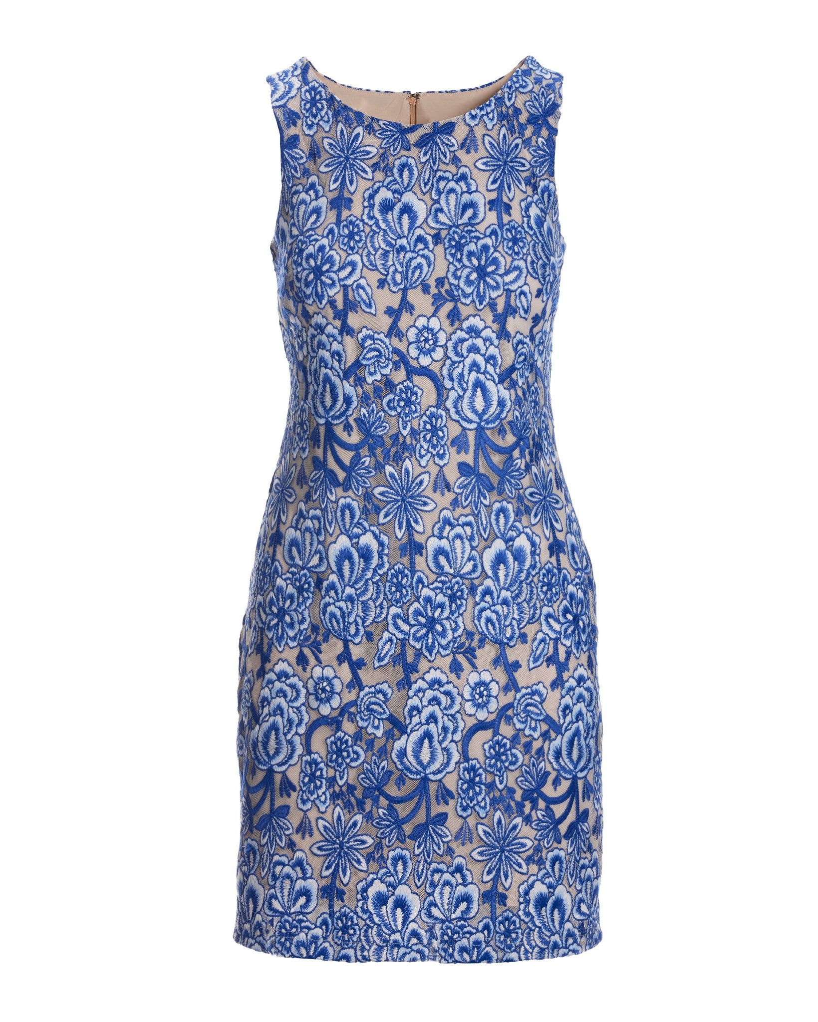 A chic and polished occasion look. our high-neck sheath dress features embroidered florals that pop against breathable mesh fabric to create one-of-a-kind style in a cool. crisp color palette. Layer on a blue-hued moto or cardigan for a tone-on-tone statement with on-off versatility.